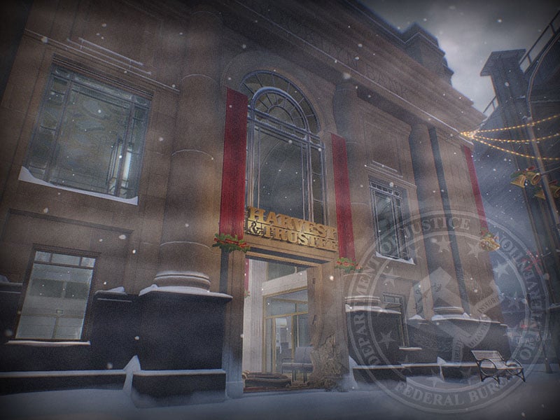 El banco "Harvest and Trustee" tiene sedes por todo Washington. Son generalmente construcciones de carácter simple, con puertas traseras, acceso al tejado y cámaras controladas desde una sala. La mayoría de las sedes contratan a tres o cuatro guardias de seguridad, y el personal de cajeros está entrenado para bajar las persianas en caso de un asalto.